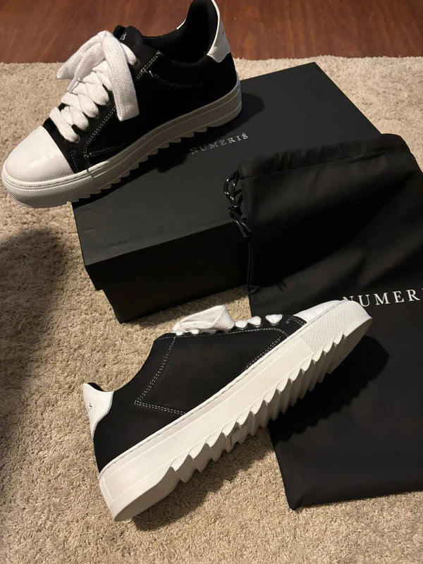 La sneaker Arena allie luxe quotidien et esthétique sportswear. Disponible en coloris vibrants, la version Eclipse présente une tige en cuir italien brillant intégral - mise en valeur par des lacets blancs texturés de 10 mm. L'intérieur de la chaussure est doté d'une doublure au niveau du col offrant un confort inégalé. La tige repose parfaitement sur notre semelle blanche personnalisée semelle. La semelle elle-même présente le logo Numeriś embossé à l'arrière et est gravée sur la sous-semelle.