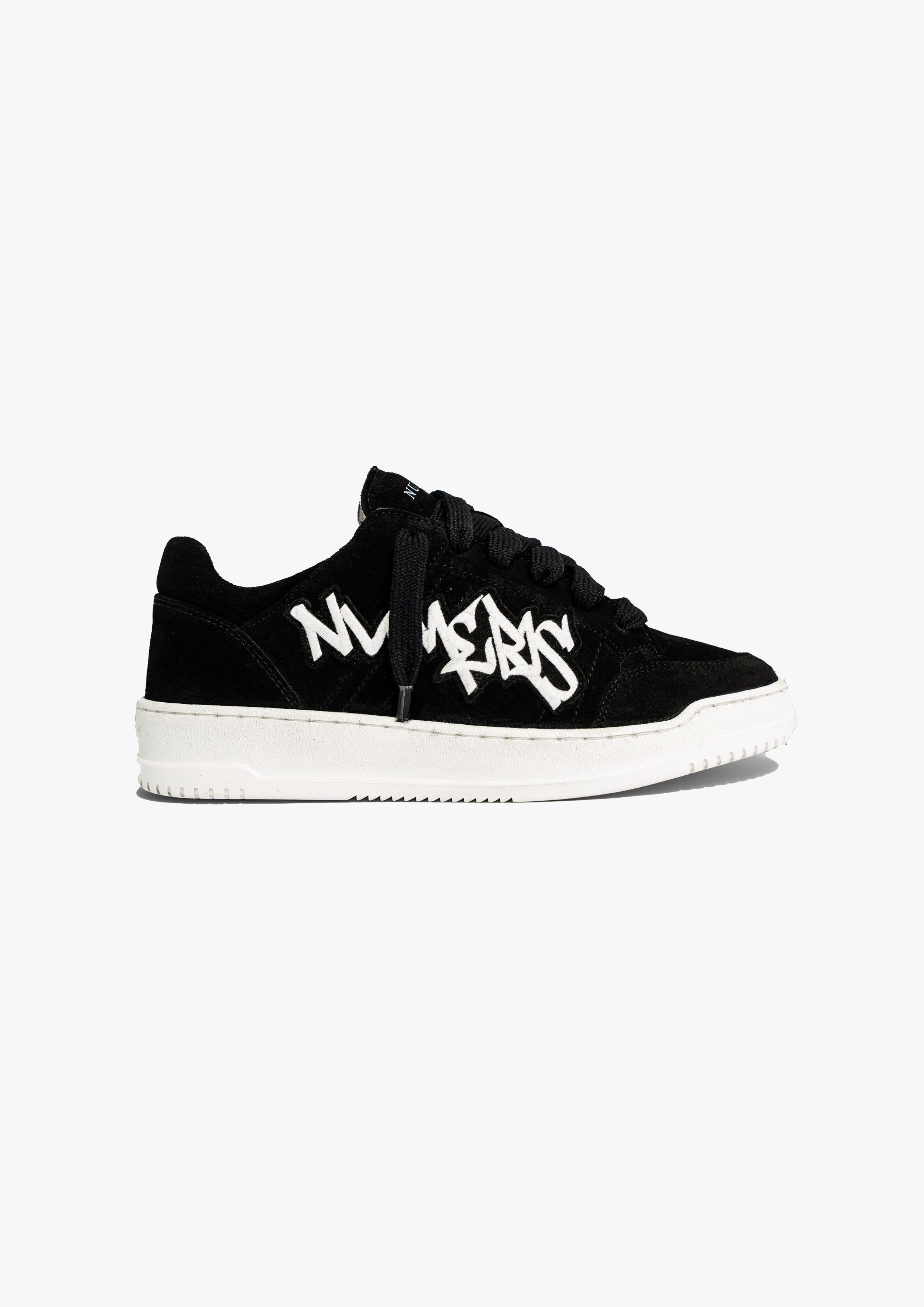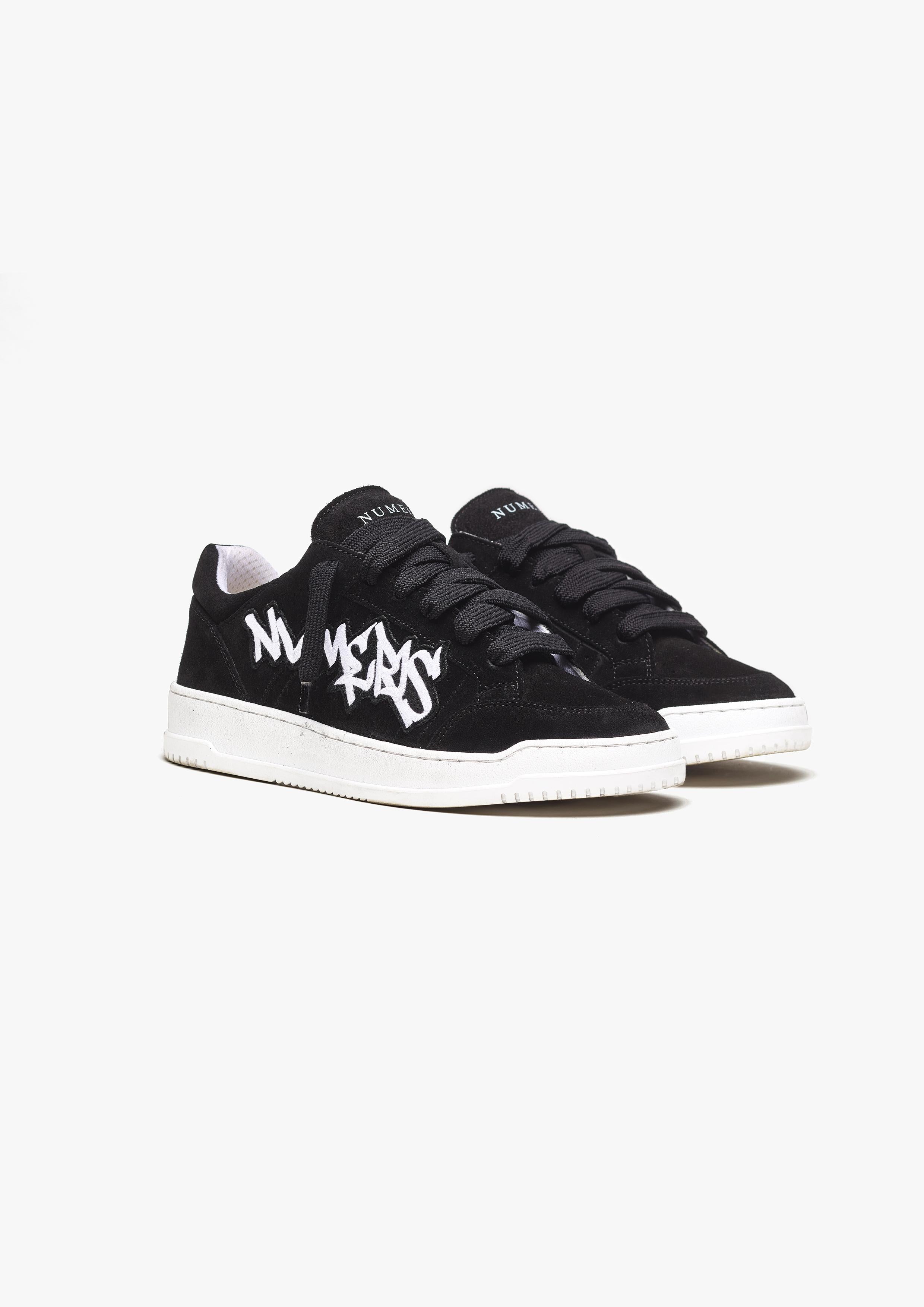 The Arena Sneaker combine le luxe quotidien et l'esthétique sportswear. La version Phantom présente un daim noir italien ainsi qu'un patch brodé blanc personnalisé, dessiné à la main. Le tout est complété par des lacets texturés noirs de 10 mm. L'intérieur de la chaussure comporte une doublure au niveau du col offrant un confort inégalé. La tige repose parfaitement sur notre semelle blanche personnalisée. fr semelle. La semelle elle-même présente le logo Numeriś embossé à l'arrière et est gravée sur la sous-semelle.