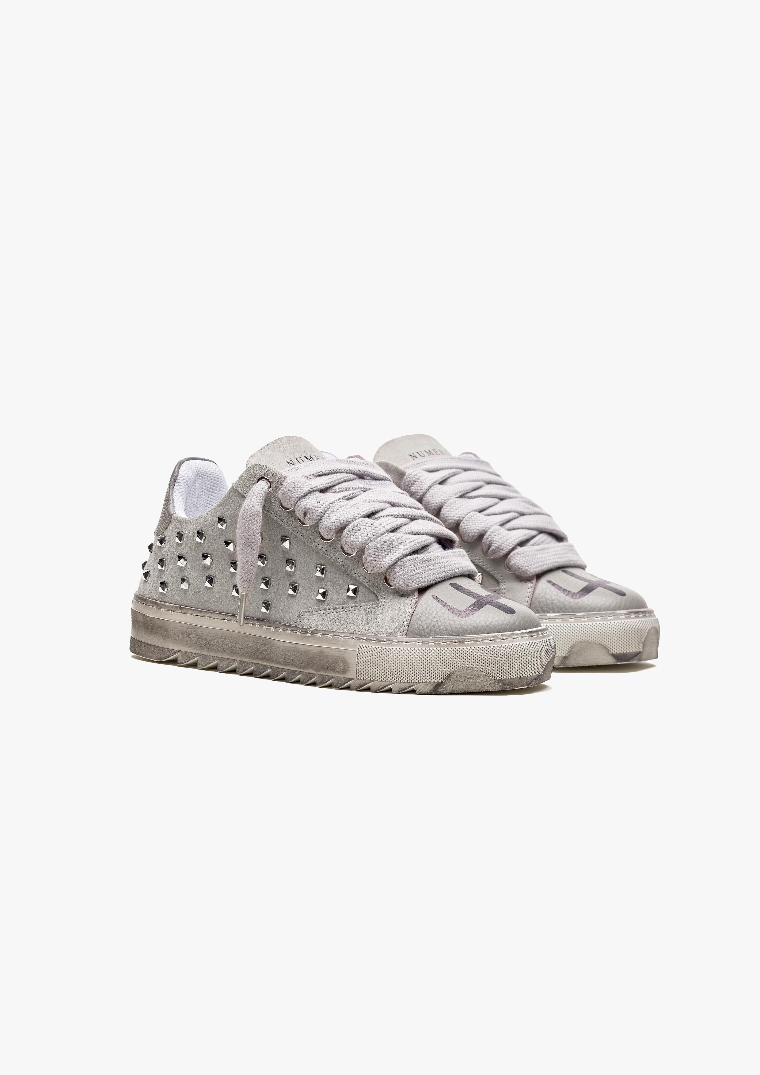 Ogni cucitura e dettaglio riflette un design meticoloso, offrendo una sensazione di lusso raffinato. La colorazione Diesel presenta una tomaia in suede grigio chiaro premium di origine italiana, arricchita da borchie in metallo argentato lungo i pannelli laterali. Le cuciture tono su tono esaltano l’estetica sofisticata, mentre il puntale in pelle grigia testurizzata aggiunge un tocco distintivo, con la taglia della scarpa impressa come dettaglio unico.