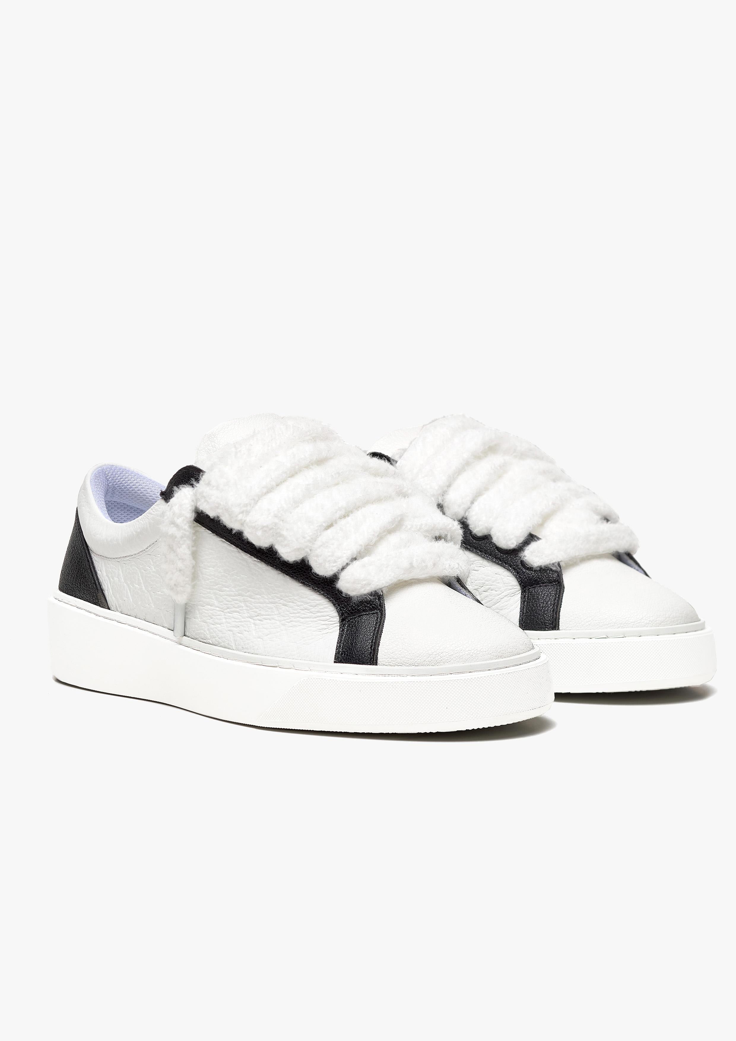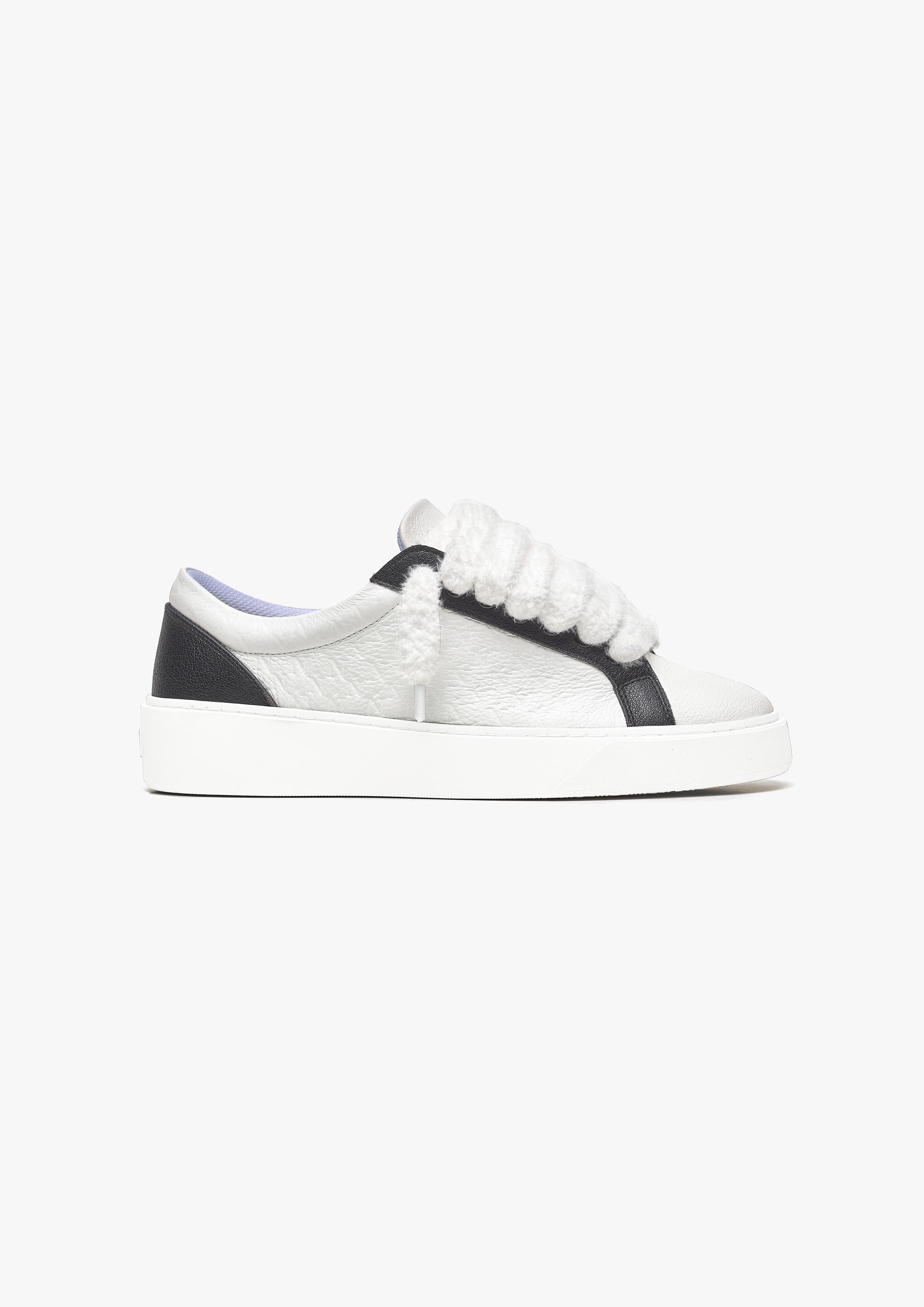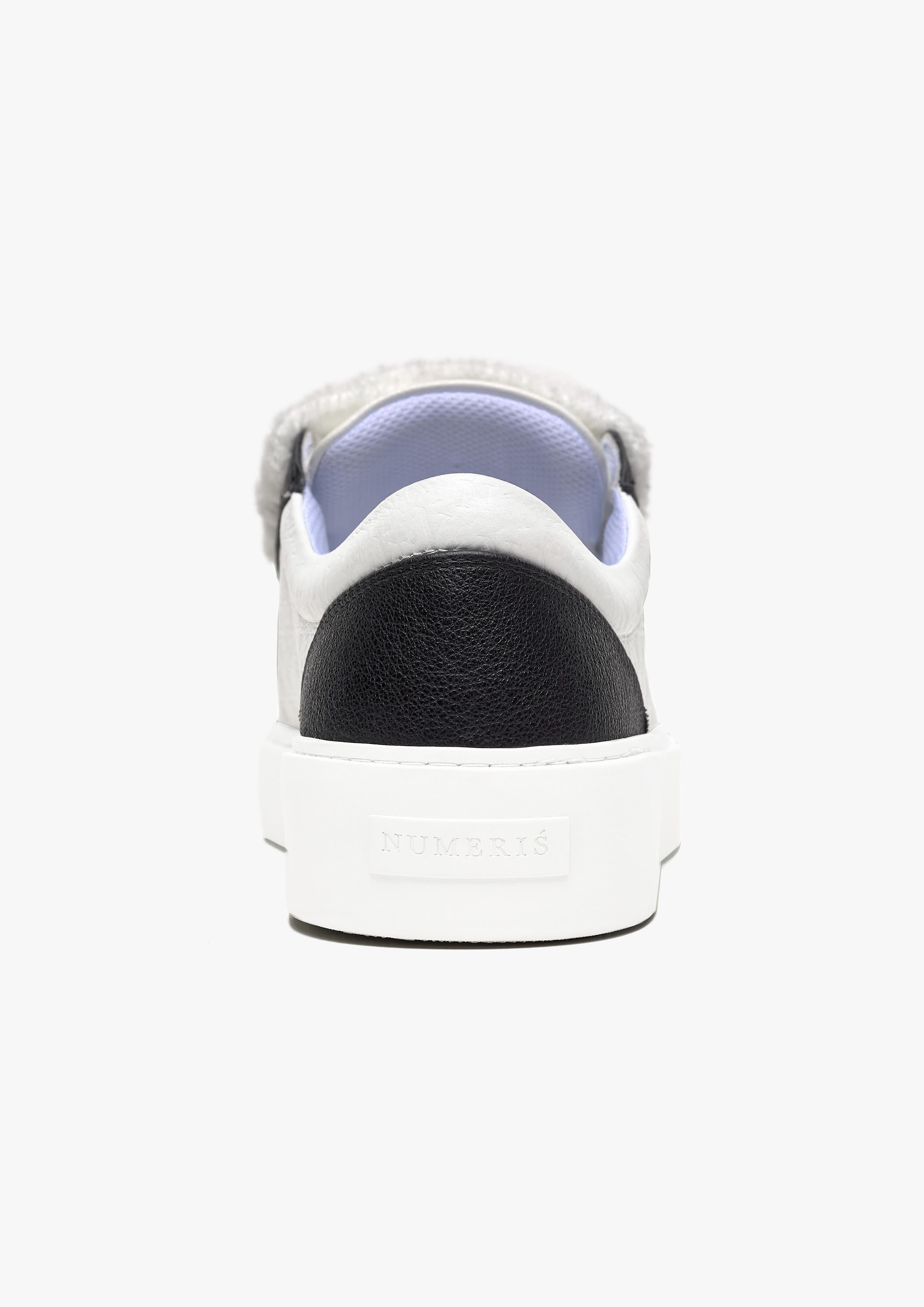 La sneaker monochrome est composée d'un mélange de cuir italien doux blanc et noir, accompagné des lacets blancs moelleux emblématiques de Sigńet. Des empiècements latéraux en relief doux sur mesure sont ornés du monogramme du logo Numeriś « N ». L'intérieur de la sneaker est doté d'une doublure de col blanche offrant un confort inégalé. La tige repose parfaitement sur notre toute nouvelle semelle en caoutchouc complexe, fabriquée exclusivement pour Sigńet. Notre logo argenté distinctif est positionné sur la languette.