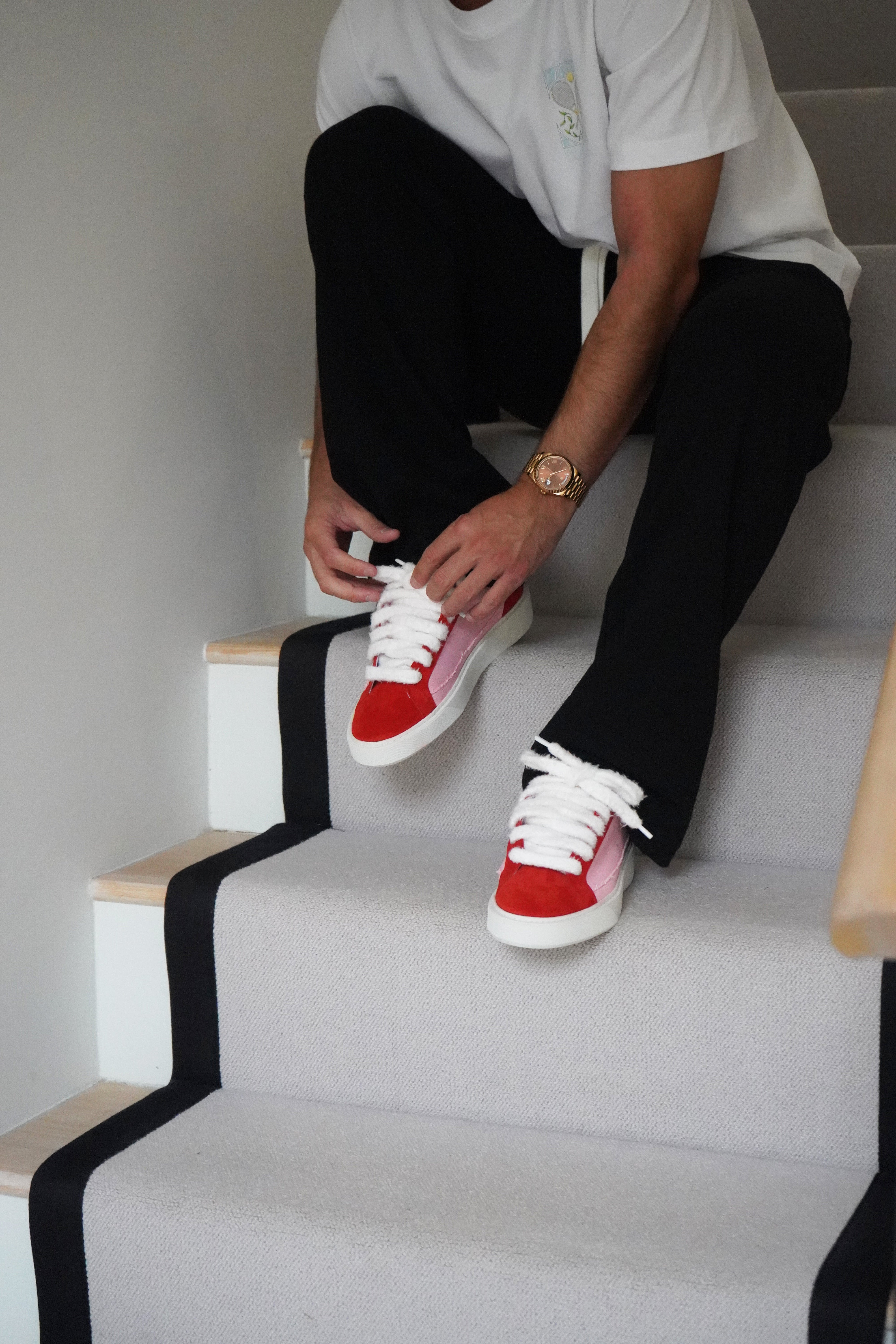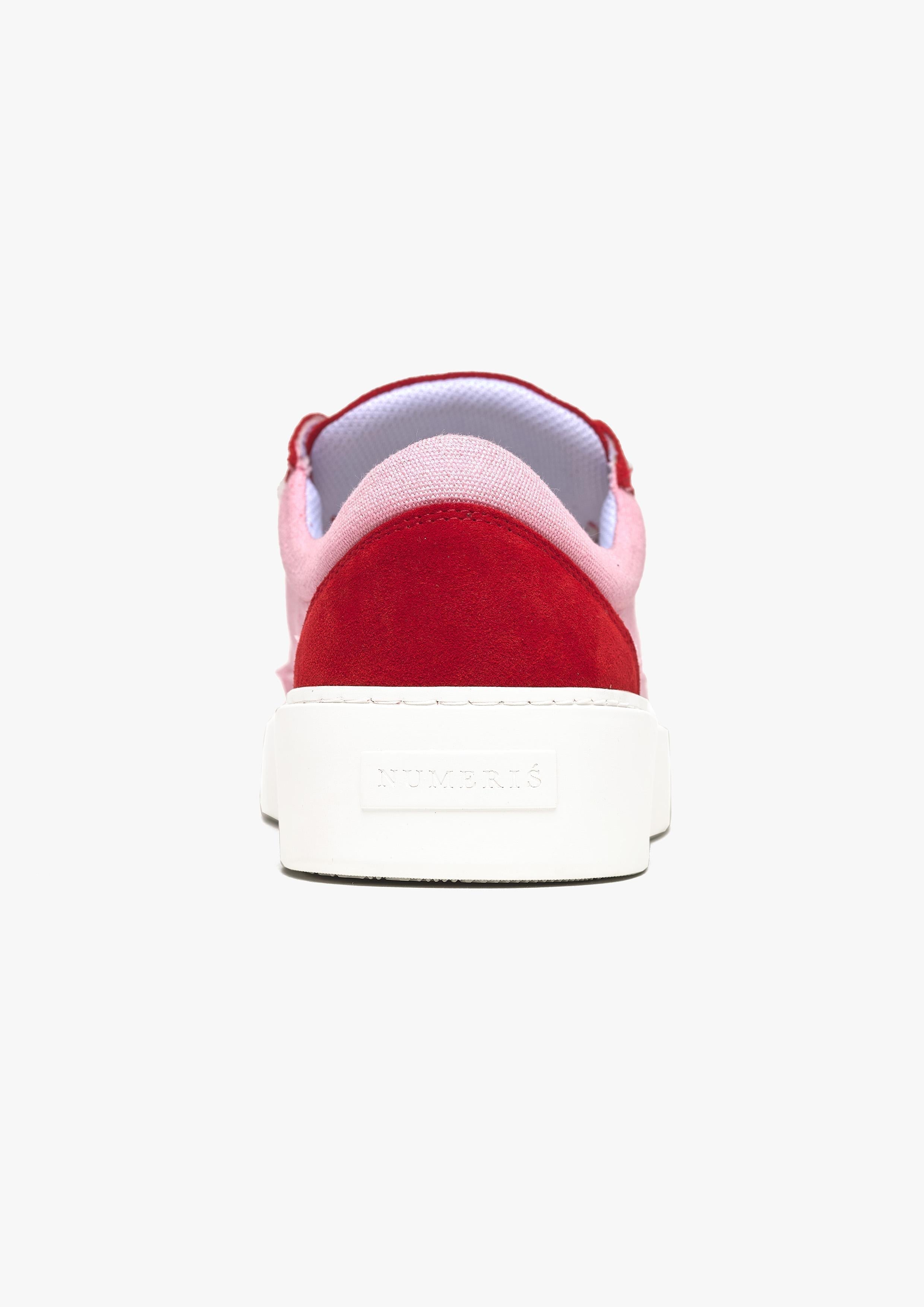 La sneaker Sigńet est composée d'un mélange de daim italien et de toile espagnole, de lacets blancs moelleux de 20 mm et de panneaux latéraux en toile rose clair accompagnés d'un riche daim rouge. L'intérieur de la sneaker est doté d'une doublure de col blanche offrant un confort inégalé. La tige repose parfaitement sur notre toute nouvelle semelle en caoutchouc complexe, fabriquée exclusivement pour Sigńet. Notre logo argenté distinctif est positionné sur la languette.